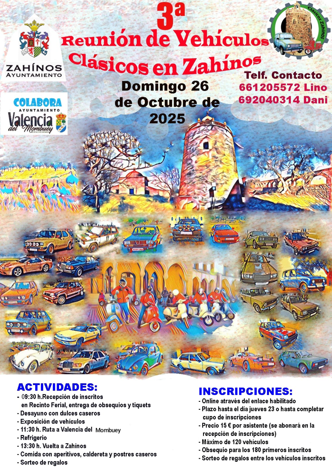 Este domingo 26 de Octubre, tendremos en nuestra localidad la concentración de coches clásicos organizada por el ayuntamiento de Zahínos. Los vehículos estarán expuestos en las Calles Marqués de Valdeterrazo, Duquesa de Montpensier y Plaza de España, por lo que está prohibido aparcar a partir de las 10:30 h en dichas calles.