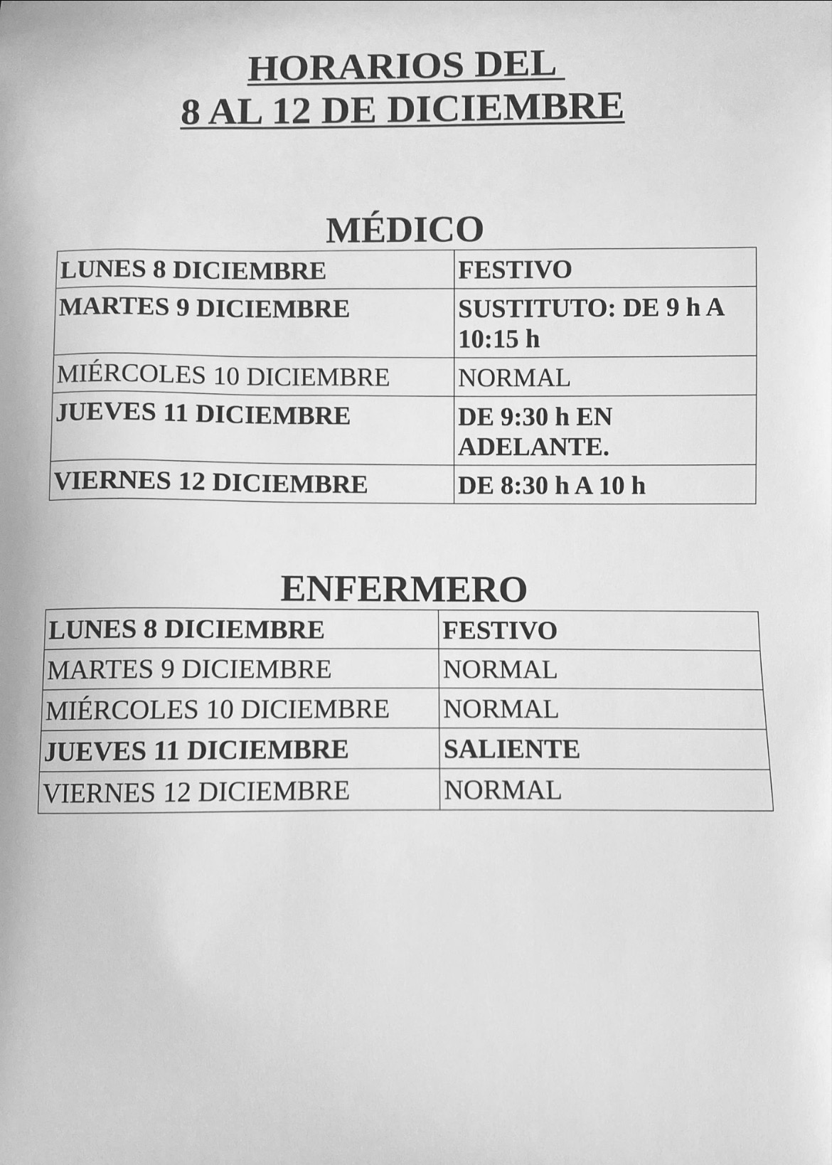 Nos informan desde el consultorio médico que hoy no vendrá el médico, el enfermero tiene el horario habitual. -