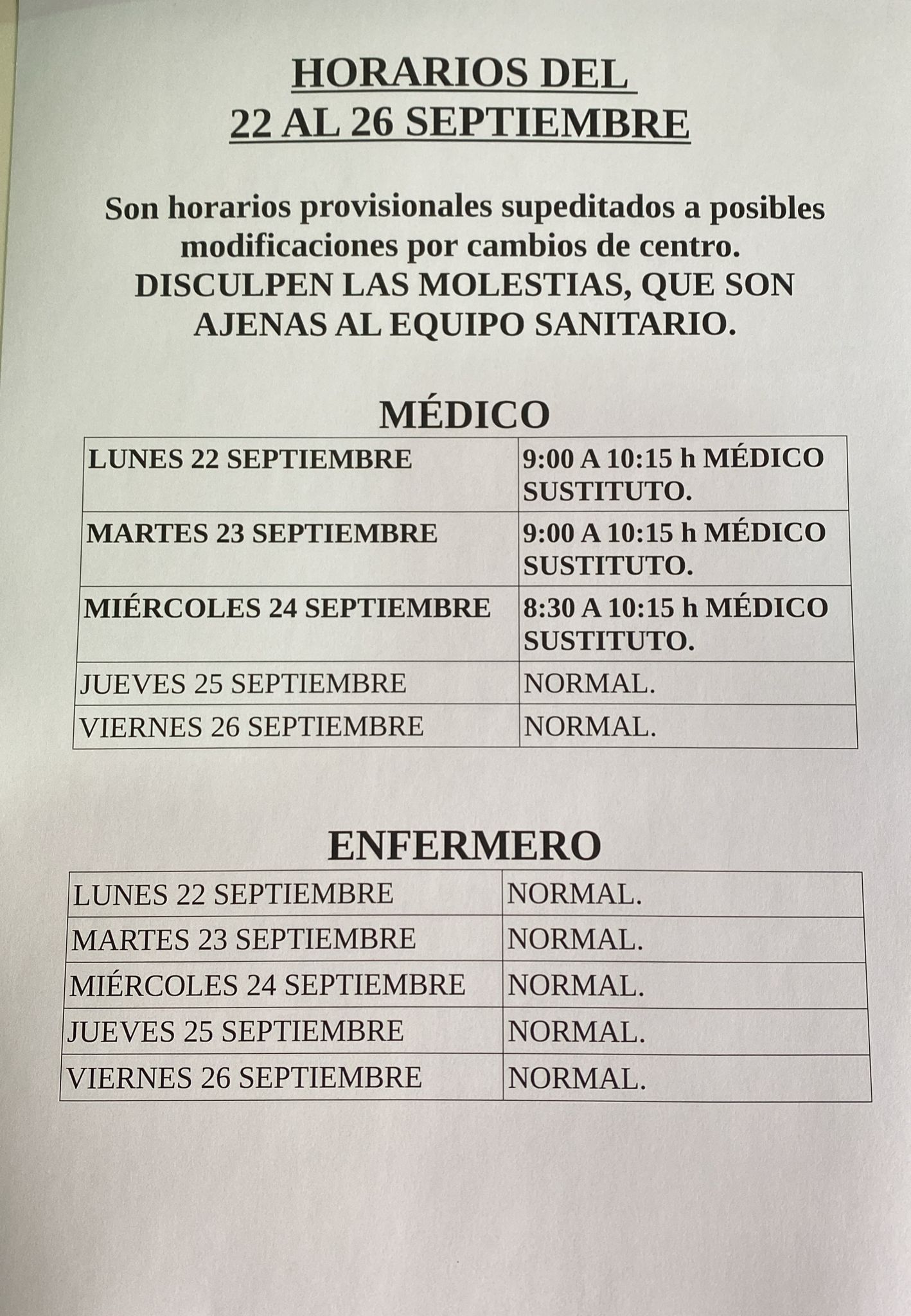 Horarios del consultorio médico para la próxima semana. Estos horarios pueden verse afectados a cambios. Disculpen las molestias.